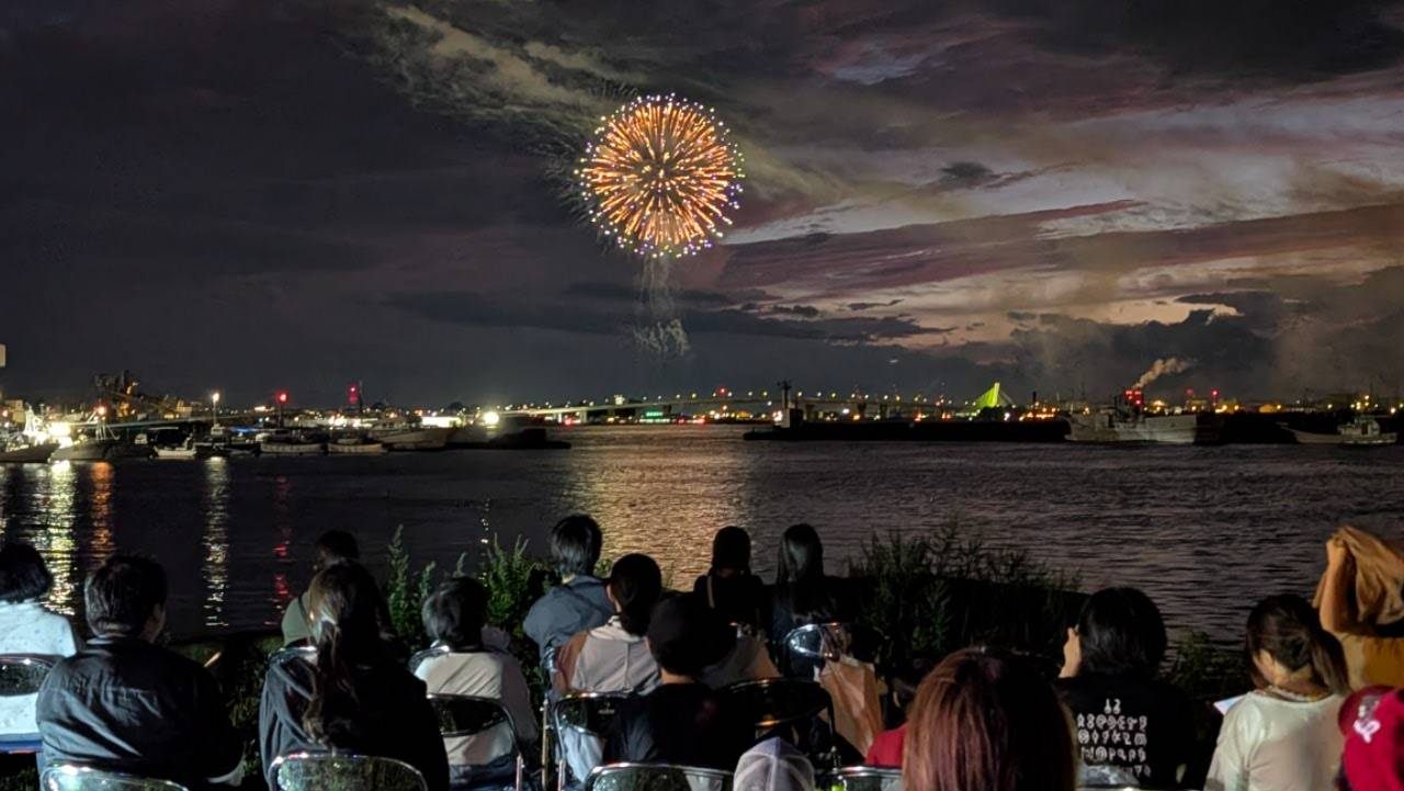 8月17日 蕪島からの花火鑑賞会 直前まで大雨で実施されるかも危ぶまれましたが、私たちの祈りが通じたのか、無事に花火を鑑賞することができました。予定として蕪島近くの3つの町内の方々をご招待し、観覧席をご用意しておりましたが直前まで雨ということもあり集まりませんでした。その代わり、花火見学に来られた方々にその場所を提供することができました。花火が真正面から鑑賞できる最高の場所で、皆さんに喜んでいただきました。