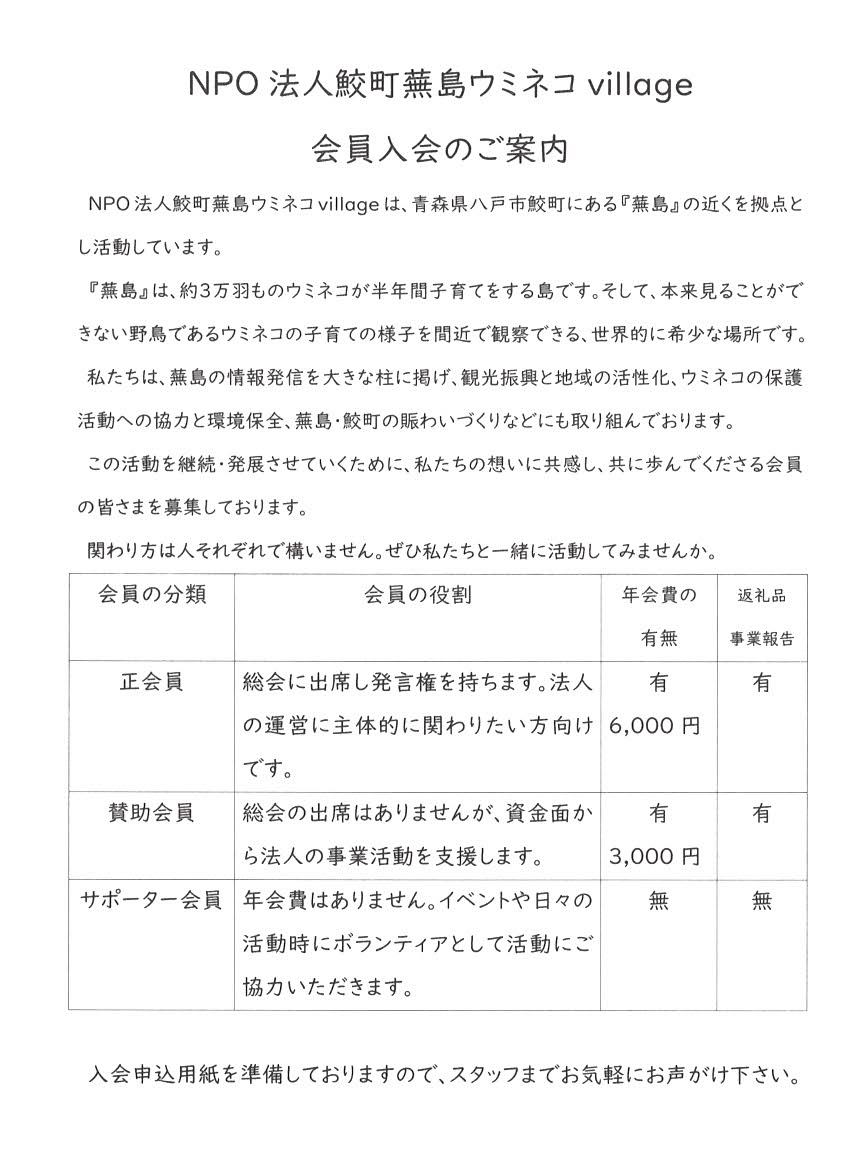 賛助会員に入会して下さる方は、QRコードからお申込み下さるか、直接ウミネコビレッジまでお越しください。